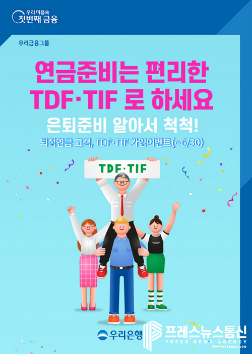 [프레스뉴스] 김대일 기자= 우리금융지주의 자회사 우리은행(은행장 이원덕)은 우리은행 퇴직연금[DC/IRP] 가입고객 중 TDF(Target Date Fund)·TIF(Target Income Fund) 매수고객을 대상으로‘연금준비는 편리한 TDF·TIF로 준비하세요!’이벤트를 6월 30일까지 실시한다고 2일 밝혔다.