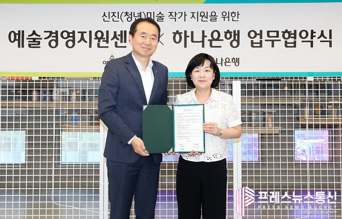 [프레스뉴스] 김대일 기자= 하나은행(은행장 이승열)은 지난 16일 서울시 을지로4가에 위치한 하나은행의 개방형 수장고 ‘H.art1(하트원)’에서 예술경영지원센터(대표 문영호)와 신진(청년) 미술 작가 발굴 및 작품 판로 지원을 위한 전략적 업무협약(MOU)를 체결 했다고 밝혔다.