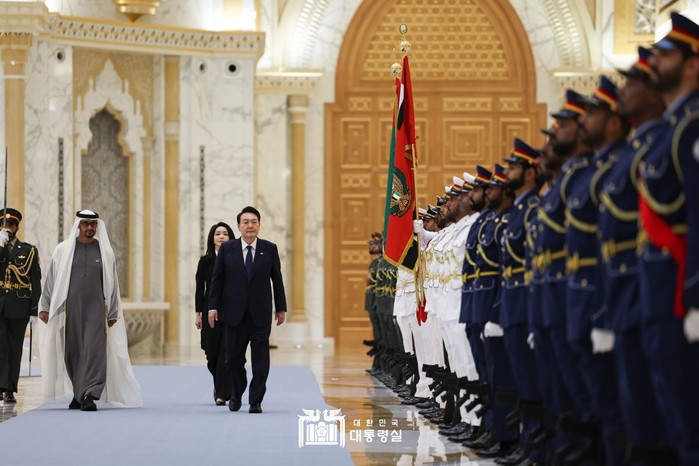 ▲ 아랍에미리트(UAE)를 국빈 방문 중인 윤 대통령이 15일(현지시간) 아부다비 대통령궁에서 열린 공식 환영식에서 모하메드 빈 자이드 알 나흐얀 UAE 대통령과 의장대를 사열하고 있다.(사진=대통령실) |