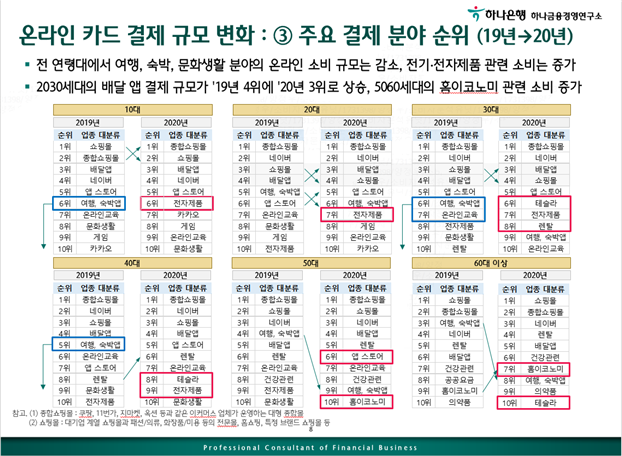 동 연구소가 2019년 1월부터 2020년 12월까지 총 2년간의 하나카드(개인 신용카드 및 체크카드 기준) 온라인 결제 데이터를 분석한 결과, 연령대별 상위 10개 소비 분야의 순위에 변화가 발생한 것으로 확인되었다. 여행, 숙박 분야는 전 연령층에서 순위가 크게 하락하거나 10대 항목에서 사라졌으나 20대는 큰 차이가 없어 국내 여행 등으로 전환했을 뿐 수요는 꾸준했던 것으로 파악된다. 반면 코로나19 여파로 인해 가정에서 머무는 시간이 늘어나고 재택근무와 온라인을 통한 교육과 미팅 등의 증가로 인해 전기·전자제품의 경우 40대 이하 모든 연령층에서 순위가 상승하였다. 또한 거리두기 여파로 외식보다 내식 횟수가 높아지며 20~50대 전연령층의 음식 배달앱 결제규모 순위도 상승세를 보였다.