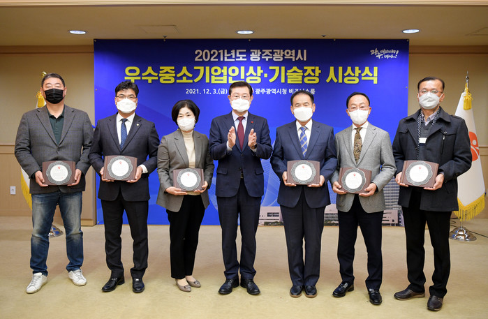 [광주=프레스뉴스] 강래성 기자= 광주광역시는 2021년 우수중소기업인 4명과 기술장 2명을 선정하고 3일 시청 비즈니스룸에서 상패를 수여했다.