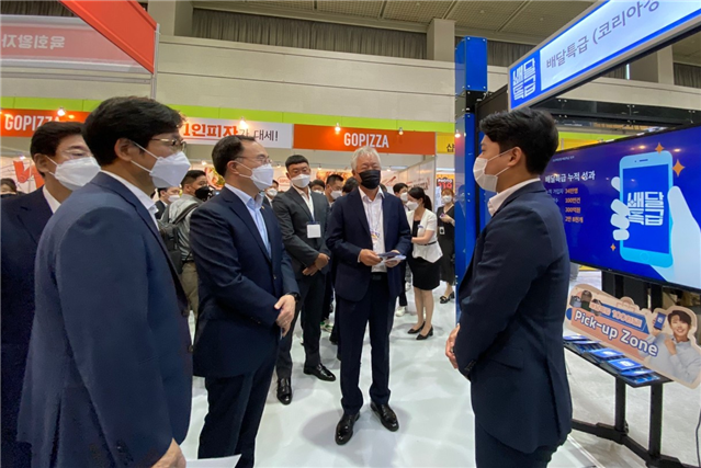 ▲ 경기도주식회사 경기도 공공배달앱 배달특급 IFS 프랜차이즈 창업박람회 참여, 문승옥 산업통상자원부 장관 부스 방문사진(2021년 7월 2일, 서울특별시 COEX) 사진=경기도 |