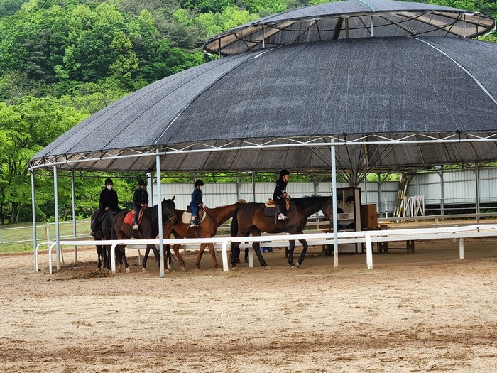 ▲신나는 주말체육 프로그램에서 학생들이 승마를 체험하고 있다./순천시 제공 |
