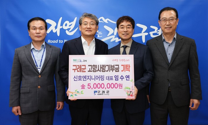 [전남=프레스뉴스] 강래성 기자= 전남 구례군은 (주)신호엔지니어링의 임수연 대표가 지난 5일 고향사랑기부금 최고액인 500만 원을 구례군에 기탁했다고 밝혔다.