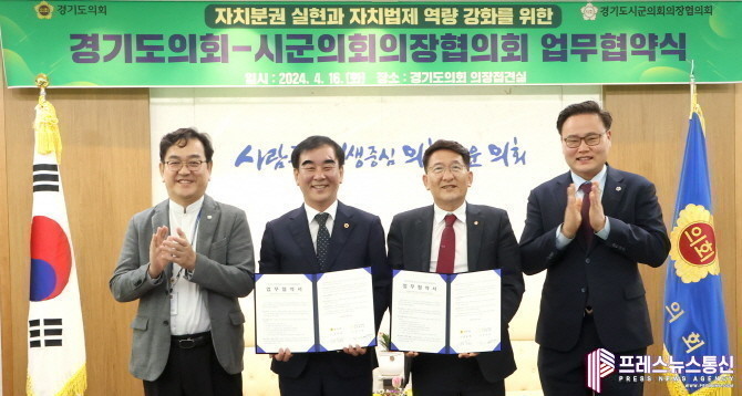 [프레스뉴스] 류현주 기자= 경기도의회(의장 염종현)와 경기도시·군의회의장협의회(회장 김기정)가 지난 16일 경기도의회 의장접견실에서 ‘자치분권 실현’과 ‘자치법제 역량 강화’를 목표로 업무협약을 체결했다.