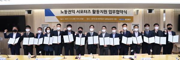 경기도는 6일 경기도청 북부청사에서 고양·부천 등 7개 시군, GS리테일, 롯데GRS, BGF리테일, 코리아세븐, 미니스톱, 이마트24 등 편의점 프랜차이즈 6개사와 ‘노동권익 서포터즈 활동지원 업무협약’을 체결했다.