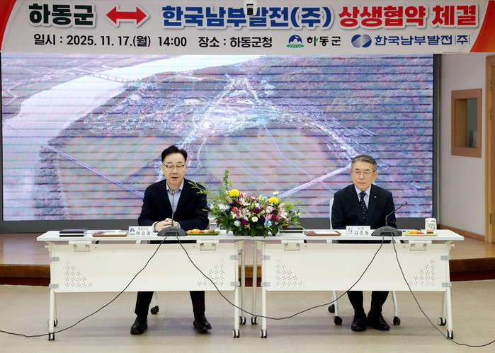 [프레스뉴스] 정재학 기자=하동군과 한국남부발전(주)은 11월 17일 하동군청에서 하동화력발전소 폐쇄에 대응하기 위한 상생협약을 체결했다.
