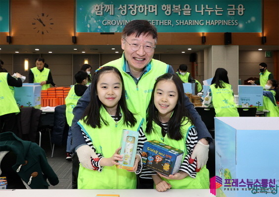 | ▲ 하나금융그룹은 지난 25일 오후 서울시 을지로 명동사옥에서 지진 피해를 입은 튀르키예를 지원하고자 그룹 임직원들의 봉사활동을 통해 긴급 구호물품을 담은 행복상자를 제작해 전달했다. 이날 봉사활동에 참석한 이승열 하나은행장(사진 가운데)이 아동용 방한용품을 들고 있는 직원 자녀들과 함께 활짝 웃으며 기념촬영을 하고 있다.(사진=하나금융그룹) |