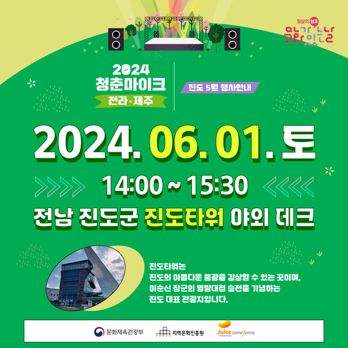 [전남=프레스뉴스] 신상균 기자= 전남 진도군 군내면 진도타워 야외 공연장에서 오는 6월 1일 오후 2시부터 1시간 30분간 ‘청춘마이크’ 공연이 열린다.