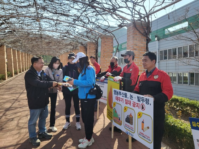군은 산불전문예방진화대원과 산림공무원 등 20여 명이 참여해 군민을 비롯한 등산객에게 ‘인화 물질 소지 금지’, ‘논밭두렁 태우기 금지’, ‘영농부산물 소각 금지’, ‘쓰레기 소각 금지’ 등 홍보물 배부와 함께 산불 예방에 동참해 줄 것을 당부했다.