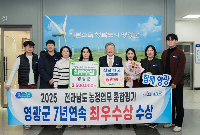 [전남=프레스뉴스] 강래성 기자= 영광군은 전라남도 2025년 농정업무 종합평가에서 7년 연속 최우수상을 수상하며, 농정 전반에서의 균형 있는 성과로 도내 최고 수준의 농정 역량을 다시 한번 입증했다.