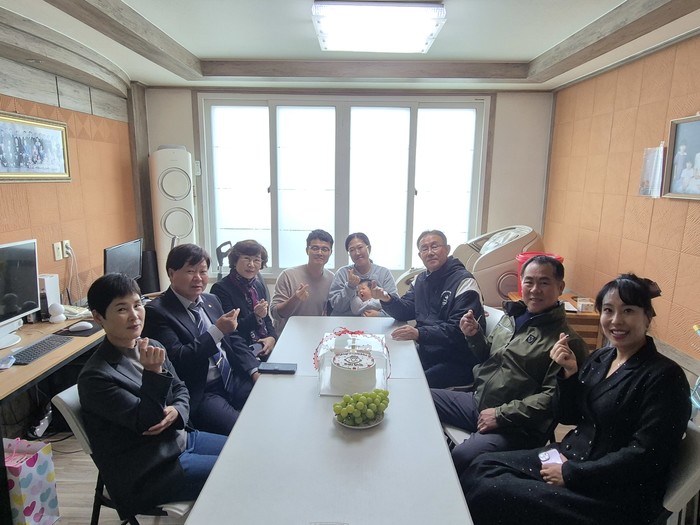 | ▲합천읍(읍장 오미화)은 25일 정대동에서 여섯째 아이가 태어난 가정을 조학래 이장협의회장, 송진룡 체육회장, 강광열 주민자치위원장과 함께 방문해 축하 케이크와 육아용품, 출산 축하금을 전달하며 출생을 축하했다 (사진=합천군) |