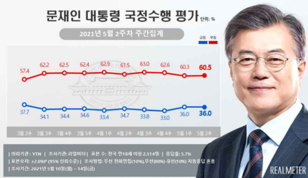 17일 리얼미터가 YTN 의뢰로 진행한 5월2주차 여론조사 결과를 보면 문 대통령의 국정수행 지지율(긍정평가)은 지난주와 같은 36.0%로 조사됐다. 부정평가는 0.2%p 오른 60.5%로 집계됐다. '모름·무응답'은 3.5%다.