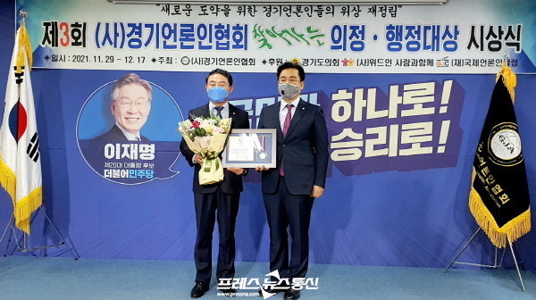 [프레스뉴스] 김대일 기자= 경기도의회 진용복(더불어민주당, 용인3) 부의장은 29일 더불어민주당 경기도당 대회의실에서 (사)경기언론인협회가 주최한 ‘제3회 경기언론인협회 의정대상 시상식’에서 ‘광역의원 부문 대상’을 수상했다.