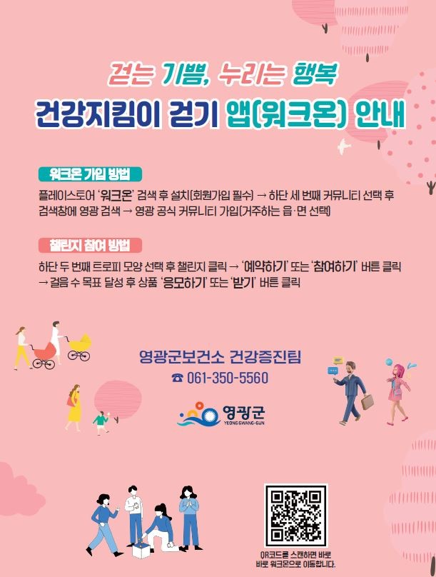 보건소 관계자는 “워크온을 통해 일상생활에서 건강한 걷기문화를 조성하고 군민들이 자발적으로 참여해 건강을 증진시킬 수 있기를 바란다” 고 전했다.