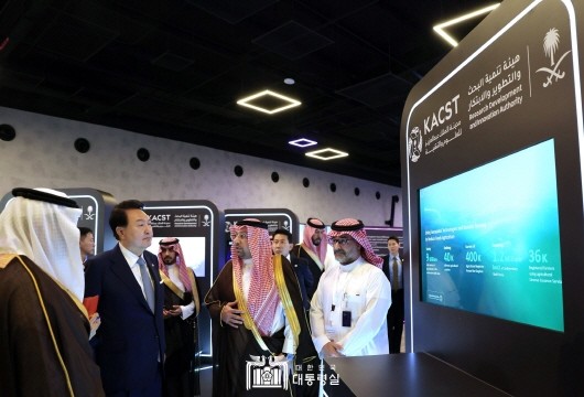 ▲사우디아라비아를 국빈 방문 중인 윤 대통령이 23일(현지시간) 리야드의 사우디 왕립과학기술원에서 열린 한·사우디 미래기술 파트너십 포럼 참석에 앞서 전시물을 관람하고 있다. (사진= 대통령실) |