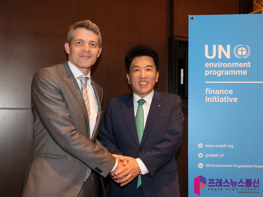 | ▲ 함영주 하나금융그룹 회장(사진 오른쪽)이 에릭 어셔(Eric Usher) UNEP FI 대표(사진 왼쪽)와 악수를 나누며 인사를 하고 있다.(사진=하나금융그룹) |