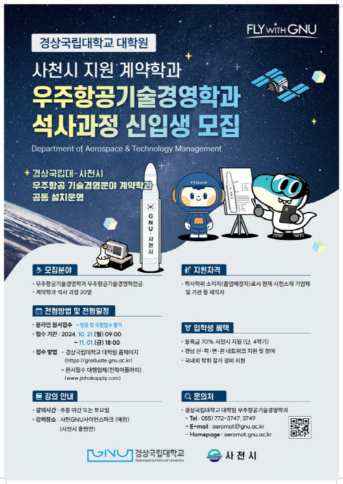 사천시에 설립된 최초의 대학원 석사과정인 우주항공기술경영학과의 모든 학생은 4학기 동안 사천시로부터 등록금의 70%를 지원받는다. 또한 재학 기간 경남지역의 산·학·연·관 네트워크에 참여할 수 있고, 국내외 학회 참가 경비도 지원받는다. 모든 교과목은 2025년부터 사천시 소재 GNU사이언스파크 전용 강의실과 실습실에서 주중 야간과 주말에 운영한다.