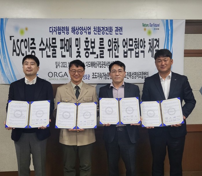 [전남=프레스뉴스] 신상균 기자= 전남 진도군이 23일 친환경 국제인증(ASC) 국제인증을 받은 친환경 수산물 판매 확대를 위해 업무협약을 체결했다.