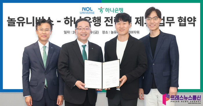 [프레스뉴스] 류현주 기자= 하나은행(은행장 이호성)은 지난 9일 놀유니버스(공동대표 배보찬ㆍ최휘영)와 「금융과 여가를 연계한 디지털 금융사업 추진」을 위한 업무협약을 체결했다고 밝혔다.
