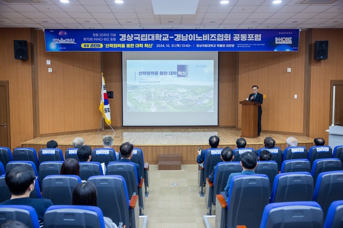 ▲경상국립대학교(GNU·총장 권진회)와 경남이노비즈협회(회장 박재근)는 10월 31일 경상국립대학교 가좌캠퍼스 박물관 1층 대강당에서 ‘경상국립대학교-경남이노비즈협회 공동포럼’을 개최했다 (사진=경상국립대) |