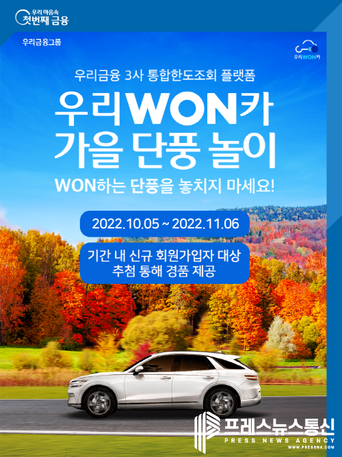 [프레스뉴스] 김대일 기자= 우리금융그룹(회장 손태승)은 우리WON카 앱을 설치하고 회원가입을 한 고객을 대상으로 ‘우리WON카 가을 단풍 놀이 이벤트’를 실시한다고 9일 밝혔다.