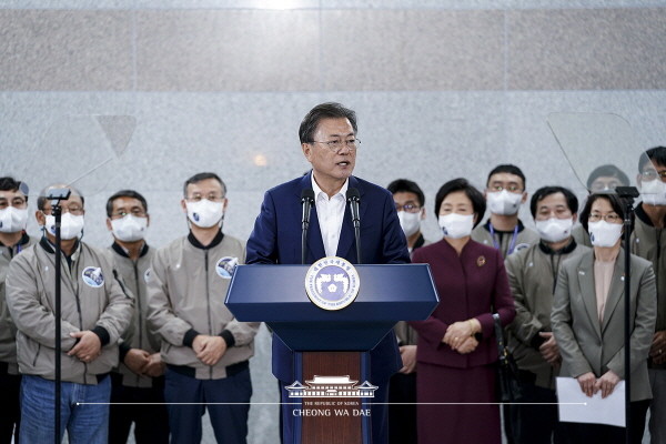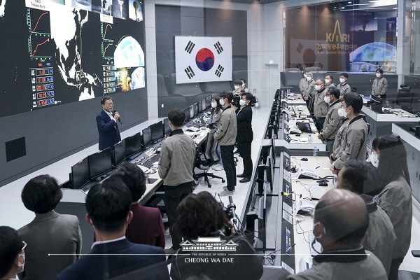 대국민 메시지 발표가 끝난 뒤 문 대통령은 연구와 개발에 매진한 누리호 연구진들을 격려하고 감사 인사를 전했다.