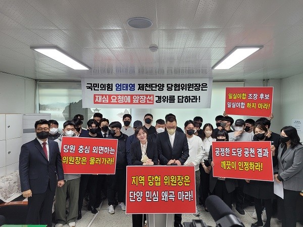 이어 이들은 엄태영 당협위원장에게 “주요 당직자들의 의견 또한 묵살하고 중앙당의 재심의 결정에 어떠한 역할을 했고, 왜 했는지, 본인이 추천한 공천심의위원을 강요에 의해 사퇴시킨 사유는 무엇인지 명확하게 알려달라”고 요구했다.