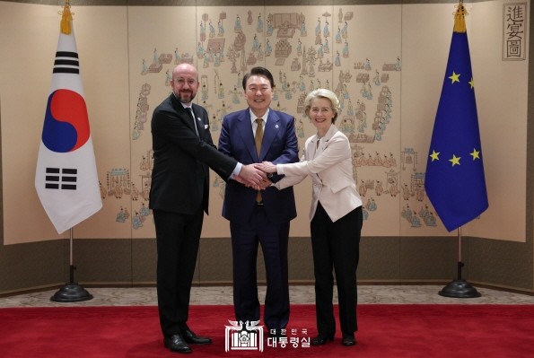 | ▲ 윤석열 대통령이 지난 22일 서울 용산 대통령실 청사에서 열린 한-EU 정상회담에서 우르줄라 폰데어라이엔 EU 집행위원장, 샤를 미셸 EU 정상회의(이사회) 상임의장과 기념촬영을 하며 손을 잡고 있다.(사진=대통령실 제공) |