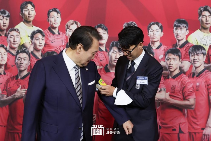 ▲ 8일 청와대 영빈관에서 열린 축구 국가대표팀 환영 만찬에서 주장 손흥민 선수가 2022 카타르 월드컵 기간 착용했던 주장 완장을 윤석열 대통령에게 채워주고 있다.(사진=대통령실) |