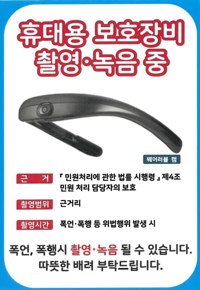 웨어러블 캠은 목걸이 형태의 카메라로 전‧후방 촬영과 녹음이 가능한 기기로 민원인의 폭언‧폭행의 사전예방을 유도하고 위법행위 발생 시 근거자료로 활용되며 민원인에게는 녹화 사실을 사전 공지하며 개인정보 보호를 위해 최소한의 용도로만 활용할 방침이다.