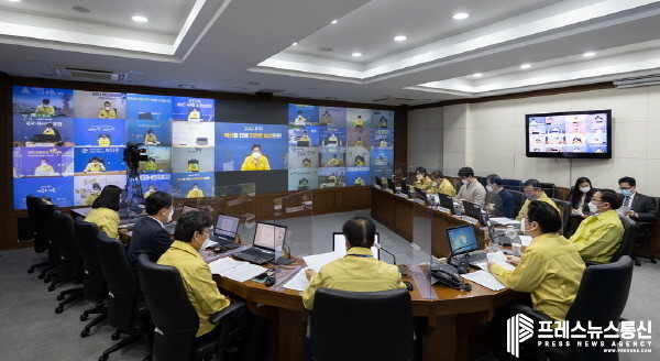▲ 23일 오전 경기도청 재난상황실에서 오병권 경기도지사 권한대행이 경기도 31개 시·군 부단체장, 경기연구원 및 한국은행 관계자 등과 함께 우크라이나 사태 관련 긴급 상황점검 영상회의를 열고 도내 사회·경제적 피해를 최소화하기 위한 대응 방안 등을 논의하고 있다.(사진=경기도) |