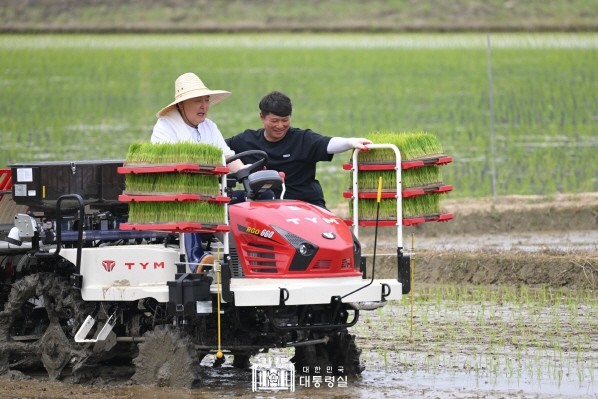 대통령은 김대남 법인대표 등과 쌀·보리 도정시설과 가루쌀 모판 만드는 모습을 둘러본 후, 청년 농업인들과 함께 벼 모판을 이앙기에 싣고 직접 이앙기에 탑승해 모내기 작업을 했다.