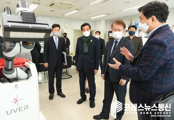 이와 함께 경기테크노파크 입주기업인 유버㈜를 방문해 코로나19 살균 특화 로봇을 직접 체험하고, 스마트공정체계 개발 및 스마트공장 기술보급을 위해 구축된 스마트제조혁신센터(SMIC) 데모공장 및 반월시화 혁신데이터센터 관제·서버실 등을 둘러보는 시간을 가졌다.