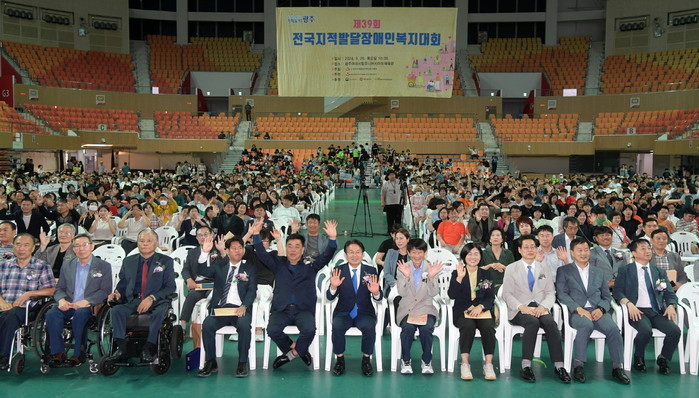 | ▲강기정 광주광역시장이 26일 오전 광주여대시립유니버시아드 체육관에서 열린 제39회 전국지적발달 장애인복지대회에 참석해 환영사를 한 후 참석자들과 함께 기념촬영을 하고 있다. /광주광역시 제공 |