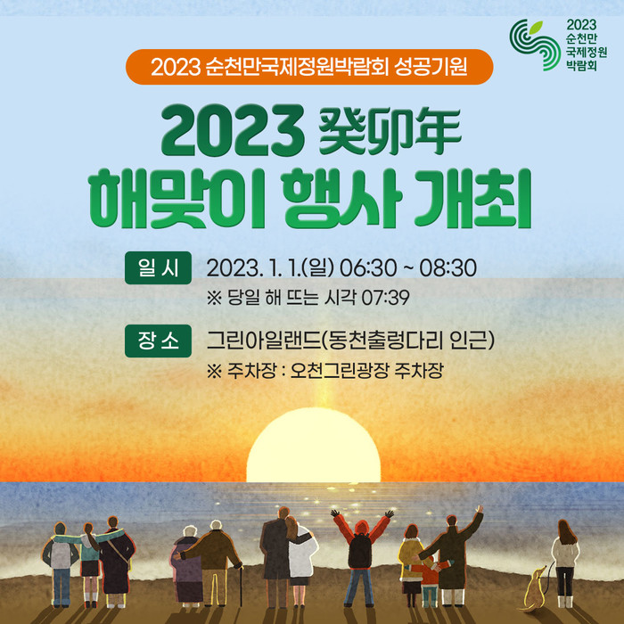 [전남=프레스뉴스] 강래성 기자= (재)순천만국제정원박람회조직위원회(이사장, 순천시장 노관규)는 오는 2023년 1월 1일 06시 30분부터 그린아일랜드에서 癸卯年(계묘년) 신년 해맞이 행사를 개최한다고 밝혔다.