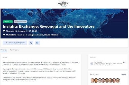 초청 안내 페이지에는 ‘경기도와 혁신가들(Gyeonggi and the Innovator)’을 주제로 현지 시각 18일 오전 11시 10분 다보스클로스터스 콩그레스 센터에서 세션(Insight Exchange)이 열린다는 내용이 담겨 있다.