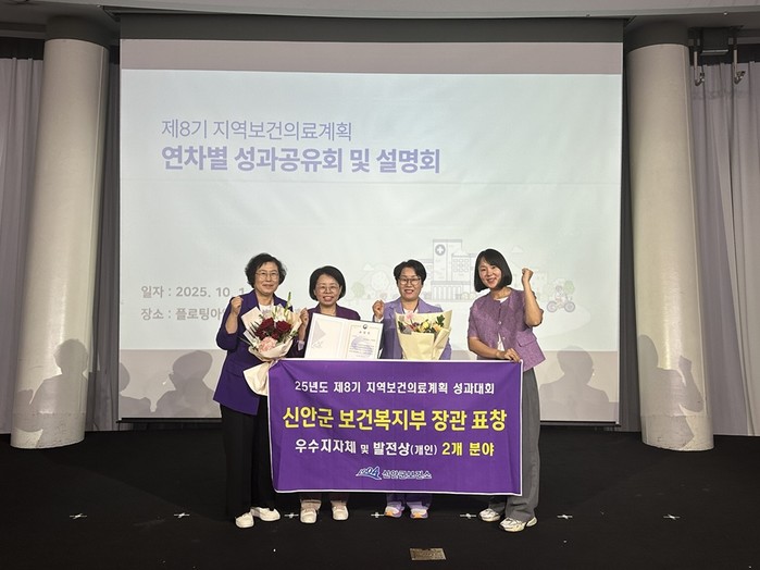 [전남=프레스뉴스] 강래성 기자= 신안군이 보건복지부 주최 ‘2025년 제8기 지역보건의료계획 성과대회’에서 보건복지부 장관 표창 2관왕을 차지하는 영예를 안았다.