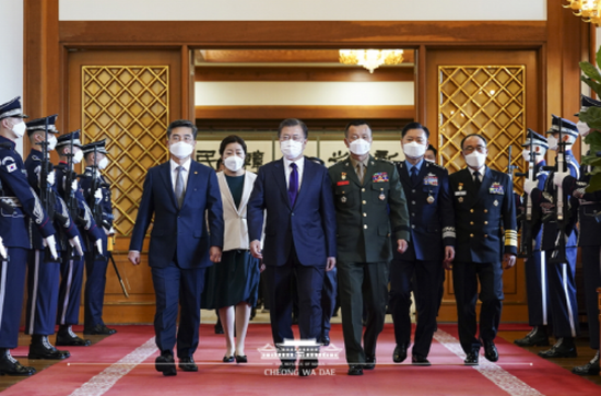 [프레스뉴스] 강보선 기자= 문재인 대통령은 4월 13일 화요일 오후 2시 28분, 청와대 충무실에서 신임 해병대사령관 진급 및 보직 신고를 받았다.