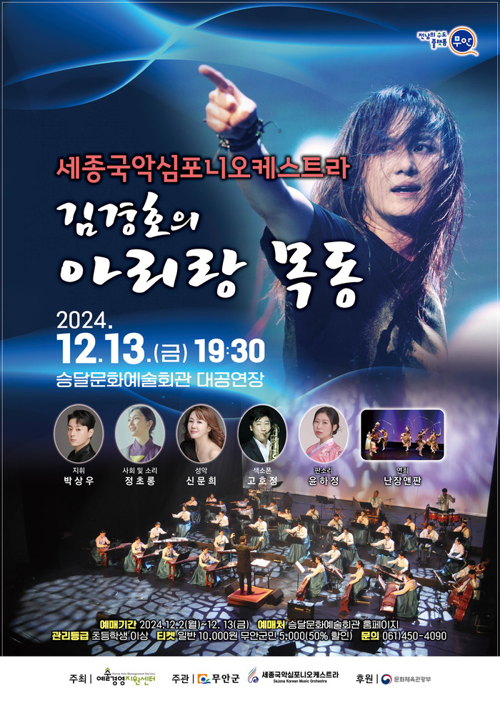 [전남=프레스뉴스] 강래성 기자= 전남 무안군(군수 김산)은 2024 공연예술유통사업에 선정된 특별 공연 ‘세종국악심포니오케스트라 & 김경호의 아리랑목동’을 오는 12월 13일(금) 저녁 7시 30분 승달문화예술회관 대공연장에서 개최한다.
