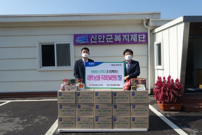 [전남=프레스뉴스] 강래성 기자= 신안군복지재단(이사장 박균보)은 지난 19일 농협 목포신안시군지부 신안군청출장소(지점장 이강동)으로부터 농협 창립 60주년 기념 사랑의 농산물 꾸러미 100박스 560만원 상당을 기부받았다고 전했다.