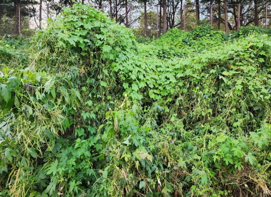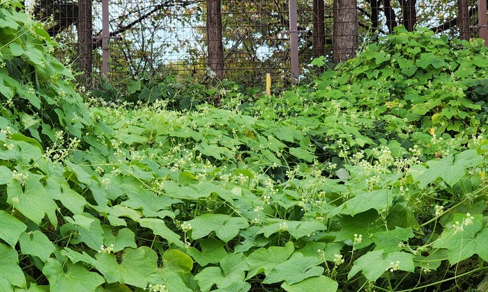 ▲가시박이 단풍잎돼지풀을 넘어트리고 환삼덩굴이 보이지 않은 정도로 그 위를 뒤덮어 버린다. |