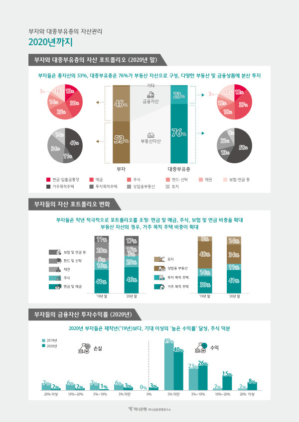 특히 주식투자의 경우, 부자와 대중부유층 모두 적극적이었는데, 이들 절반은 코로나19 이후 주식 비중을 늘렸다고 응답했으며(부자의 53%, 대중부유층의 48%), 올해 주식 시장도 완만한 상승을 예상하는 긍정적 전망이 우세했다.