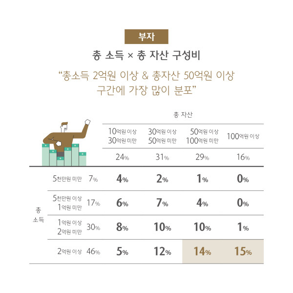 가구 연소득의 경우 부자들의 경우 2억원이상이 46%로 가장 많았고, 2억원이상 소득 구간에서 사업소득 34%, 근로소득 33% 재산소득 21% 순으로 구성되어 있었다. 반면 대중부유층의 경우 가구 총 소득은 5천만원이상 1억원 미만에 39%, 1억원이상 2억원 미만 구간에 33%가 분포되어 있었고, 전 소득 구간에서 근로소득 비중이 가장 높았다.