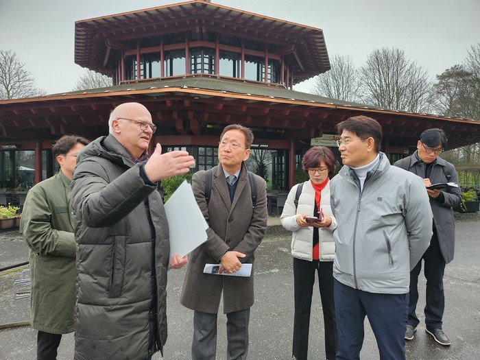 | ▲정원을 관리하는 디터 푸츠 환경녹지부서장으로부터 공원의 관리 등에 대해 설명을 듣고 있다/순천시 제공 |