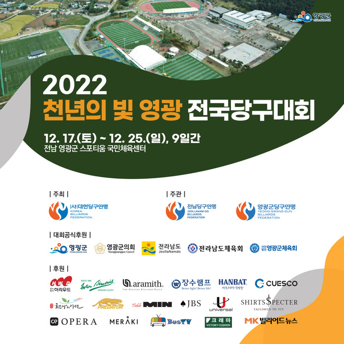 대한당구연맹이 주최하고 전라남도당구연맹ㆍ영광군당구연맹이 주관하며 영광군ㆍ영광군의회가 후원하는 이번 대회는 전문선수 700명과 생활체육선수 1,600명 등 총 2,300명이 참가하며 캐롬 3쿠션 단일 종목으로 진행된다.