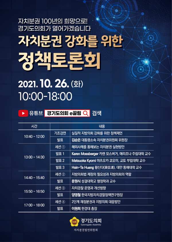 [프레스뉴스] 김대일 기자= 경기도의회 지방자치 30주년 기념 「자치분권 강화를 위한 정책토론회」가 10월 26일 화요일 경기도의회 대회의실에서 개최된다. 토론회는 코로나 19 상황을 고려하여 기본방역수칙을 준수해 최소한의 인원만이 참석하여 진행하며, 경기도의회 공식 유튜브 채널(e끌림)을 통해 생중계 된다.