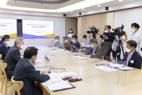 ▲ 3일 오전 경기도청 신관 2층 상황실에서 이재명 경기도지사, 도 실국장 및 강명수 경기서민금융재단설립 추진단장 등이 참석한 가운데 불법사금융 근절 및 금융소외계층 지원방안 모색을 위한 긴급대책회의가 열리고 있다. |