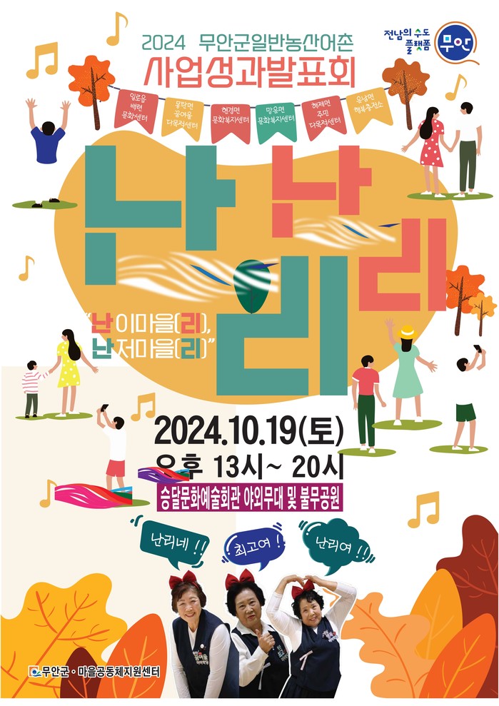 [전남=프레스뉴스] 강래성 기자= 전남 무안군(군수 김산)은 오는 19일 13시에 승달문화예술회관 광장에서 2024년 무안군 일반농산어촌개발사업 성과발표회 ‘난리난리 제2탄’을 개최한다.