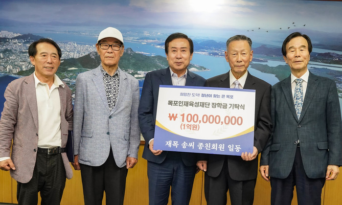 [전남=프레스뉴스] 이광남 기자= 재목 송씨 종친회(회장 송기창)가 지난 12일 목포인재육성재단(이사장 박홍률 목포시장)에 장학기금 1억원을 기탁했다.